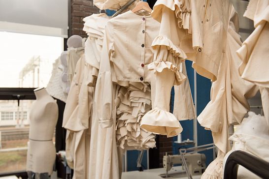 Анна Черемушкина: Следующий этап — изготовление макетов. Это уже какие-то понятные готовые вещи: воротнички, корсеты, штаны, пальто. В этот момент коллекция становится реальной, вещи сходятся в одну историю. После коллекция проходит этап примерки и демонстрации преподавателям. Здесь вы можете получать фидбэк, посмотреть на свою работу со стороны, что-то изменить и доделать.