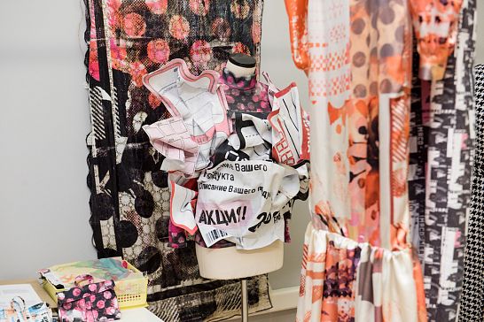 Здесь мы приходим к surface-дизайну, то есть разработке тканей для наших коллекций. Для меня это были абстрактные принты из букв. Я обратилась за вдохновением к художникам, которые делали коллажи из бумаги, в том числе из текста. Я решила, что хочу сделать что-то подобное, но из кириллицы. Также я печатала портрет моего прадедушки, его профиль. Был у меня и цветочный принт, казалось бы, что может быть проще? Но нельзя брать готовый принт, нужно отрисовать цветы. Я рисовала их от руки, одной линией, переносила их на специальную бумагу, а затем на ткань.