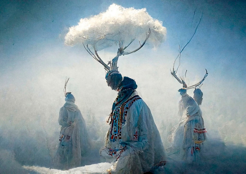 Первый проект, в котором я использовала ИИ, был связан с онлайн-книгой «Эвие. Кто она?» Это долгосрочный проект, посвященный образу жизни женщин коренных народов Севера, который мы реализовали совместно с компанией «Газпром нефть». В рамках этого проекта я создавала иллюстрации к тексту, используя коллажи из архивных снимков и музейных артефактов. Однако, когда пришло время иллюстрировать раздел, посвященный описанию мифических богинь из верований северных народов, я поняла, что коллажи не смогут передать атмосферу, и решила воспользоваться нейросетью Midjourney. В результате сгенерировала около 50 изображений, прежде чем достигла желаемого результата.