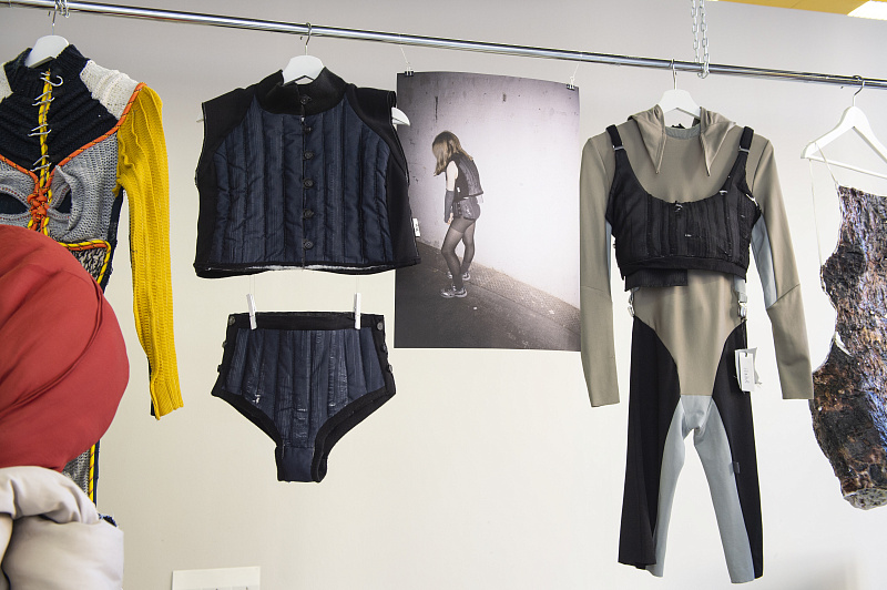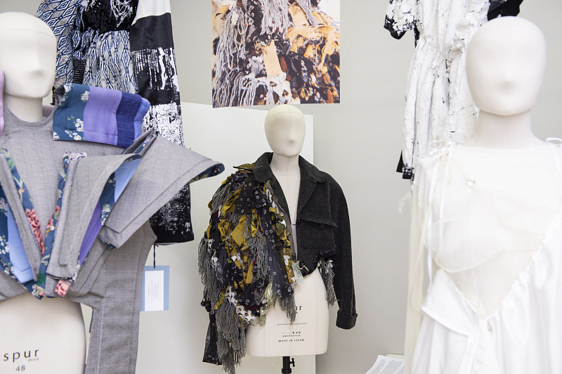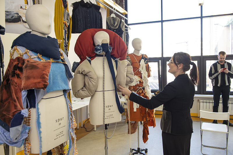 «Эта коллаборация не только про преобразование старых вещей, не только про экологию, это такой своеобразный сторителлинг. Прежде чем у созданных заново вещей появилась история, пришлось в прямом смысле ее нащупать», — рассказывает куратор программы BA (Hons) Fashion Design Клэр Лопман. Эту идею поддерживает и студентка курса Анастасия Тугова: «Когда я открыла свой ящик, внутри было много разных тканей, но никакого подтекста. Поэтому первым решением было разобраться в текстурах. На поиски нужной субстанции ушло порядка двух месяцев. Я неделями сидела дома с паяльником и перебирала все возможные варианты тканей. Но это того стоило».