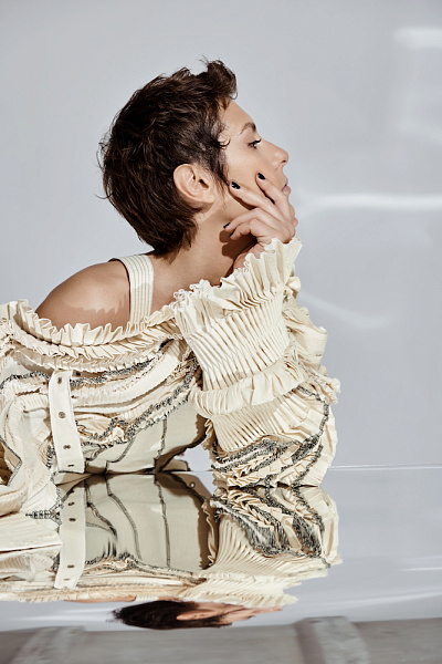«Признаться, все осознавали, что шанс того, что эта авантюра зацепит актрису, был ничтожно мал, но он был, и мы предпочитали верить в это. И это дерзкое предложение заинтересовало актрису, она тут же спросила о концепции, идеях, нашем виденье всего процесса, и начались переговоры. 22 октября команда LNVL собралась в студии, затаив дыхание. Мы все безумно волновались, что получится не так, как мы представляли. Но как только Ира надела гармент, мы выдохнули с восторгом — движения актрисы моментально оживили одежду, она двигалась так, будто этот лук был создан для нее. Зеркала, циклорама и её улыбка стали той самой недостающей частью проекта».