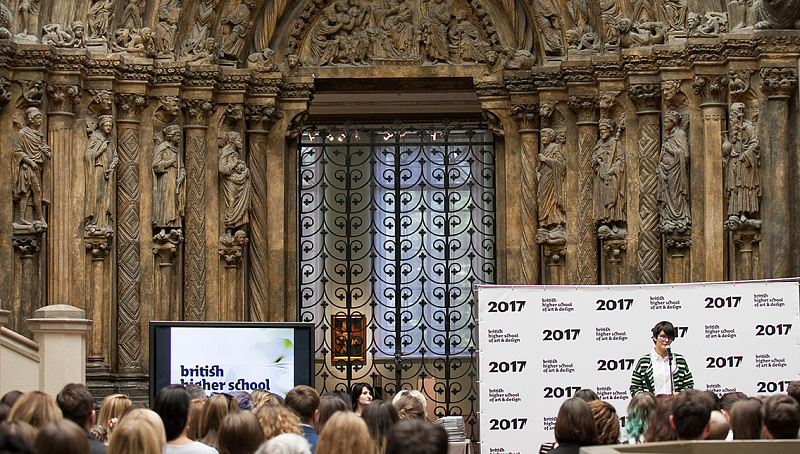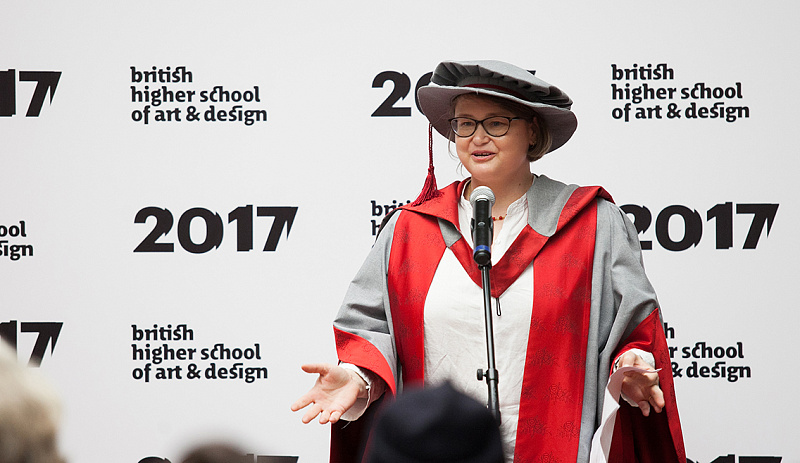 С приветственной речью перед выпускниками выступили директор Британской высшей школы дизайна Анастасия Бутрым, руководитель британских программ Тим Симмонс и помощница декана Школы креативных искусств Университета Хартфордшира, доктор Меган Найт.