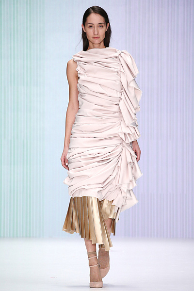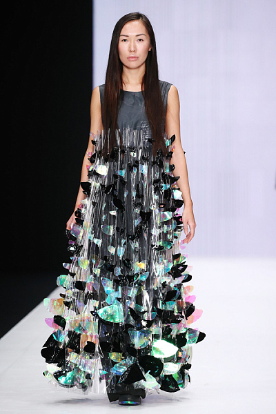 Ксения Дорогова вдохновилась темной атмосферой города, а в ее коллекции лейтмотивом служит идея использования вспышек-воспоминаний и доминирование чёрного цвета.