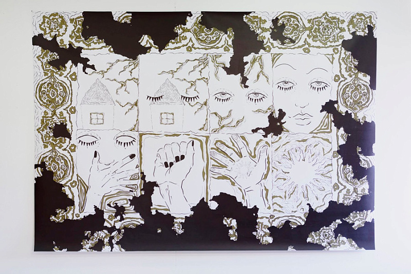 «Концепт моего проекта состоит в том, что люди зависимы от своего отражения в зеркале. Никто не может пройти мимо отражающей поверхности, не взглянув на себя. Но картина, которую мы видим в зеркале — это ложная реальность. Чтобы передать эту идею визуально, я работала с дизайном текстиля. В итоге создала небольшую инсталляцию, используя различные техники и такие материалы, как стекло, пластик, зеркало. Также я спроецировала один из паттернов на инсталляцию, чтобы создать ощущение обмана и неясности», — Полина Столбова, студентка Foundation Art & Design.