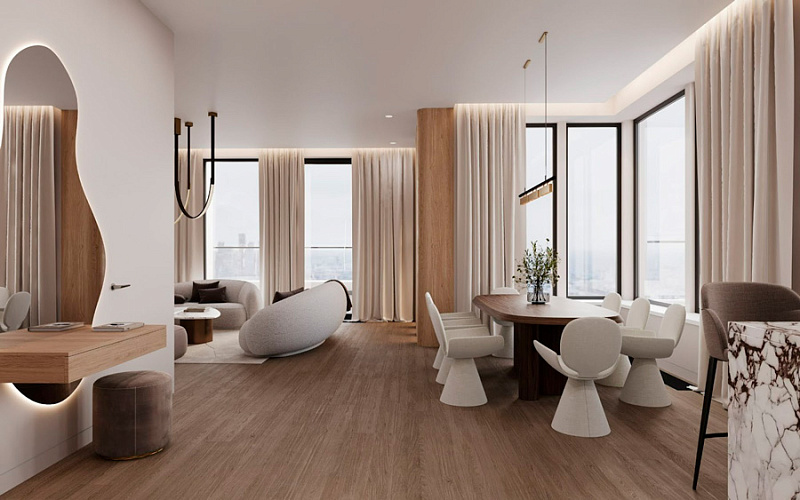 Перед участниками стояла задача создать дизайн-проект для одной из квартир в жилом небоскребе премиум-класса THE FIVE на Ленинском проспекте. В ходе работы необходимо было учитывать особенности планировки: высокие потолки, наличие камина или террасы, угловое остекление.