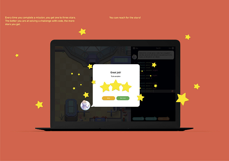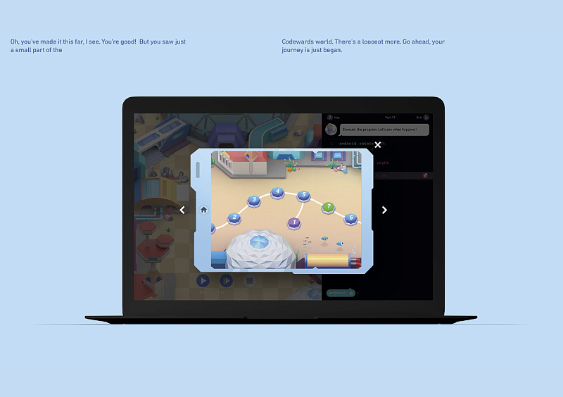 С учетом новых функций и накопившегося фидбека мне нужно было срочно обновить интерфейс. Это был супер-челлендж: на работу у нас было всего 2 недели (привет, бессонные ночи и море переживаний). Мы снова работали в паре: Сергей Гальцев — арт-директор, я — дизайнер. Решение, которое мы предложили, понравилось всей команде, его интегрировали и для «Часа кода», и для основного проекта. И вуаля – в ходе акции около 10 000 000 детей написали свою первую строчку кода в тренажере на базе «Кодвардса»!