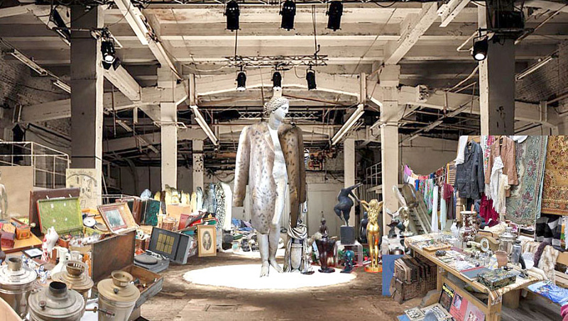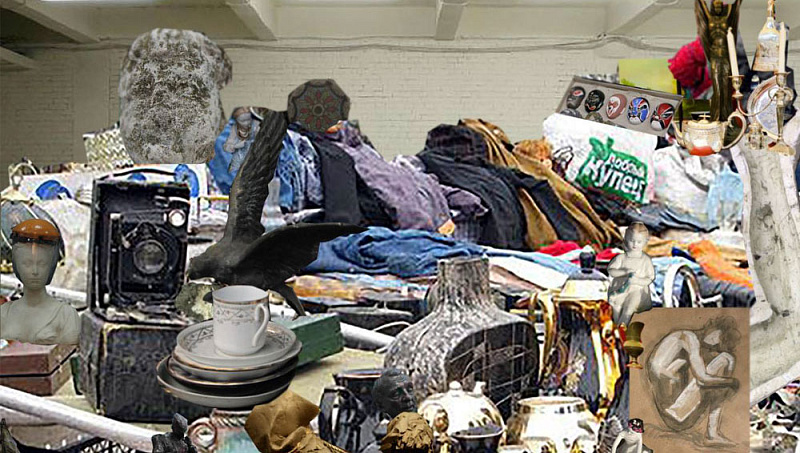 Экспозиция представляется как некая инсталляция, отдаленно напоминающая постсовесткую барахолку, в которой, при ближайшем рассмотрении можно обнаружить элементы необычные, чужеродные этой среде, с элементами графики, различных объектов, не используемых более, разваленные скульптуры вперемешку с рваными кусками меха, гипсовые слепки рукавов и воротников, аляповато раскрашенные и тонированные в манере псевдоакадемизма.