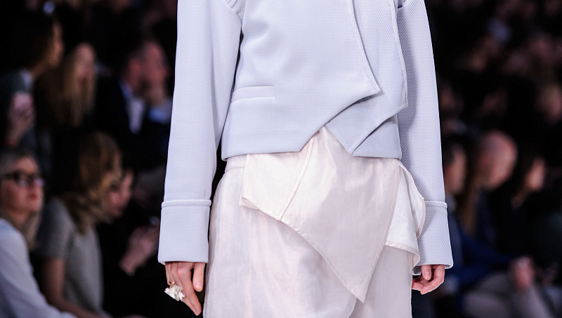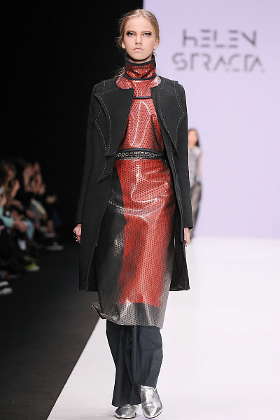 «Энергия и вибрации воды» — коллекция марки Helen Stracta, основанная на идее энергии водных ресурсов Земли. Вдохновением для автора стали факты о Великой рукотворной реке в Ливии, арабском искусстве и даже корневая система цветов пустыни. Дизайнер использует металлизированный хлопок, плащевку с мембраной, натуральный шелк, полиуретановую сетку, а также ткань, созданную по авторскому рисунку путем резки и вышивки.