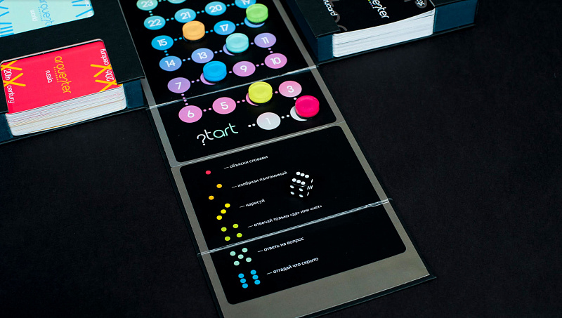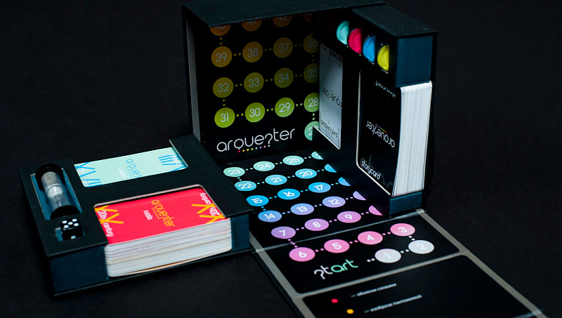 В комплект игры входит коробка ручной сборки (она же игровое поле), 4 колоды карт, фишки, кубик, песочные часы и мобильное приложение, которое можно скачать бесплатно в AppStore или Google Play. В Arquester могут играть художники, дизайнеры, искусствоведы, критики театра и кино, а также просто любители искусства, увлекающиеся люди и даже дети.