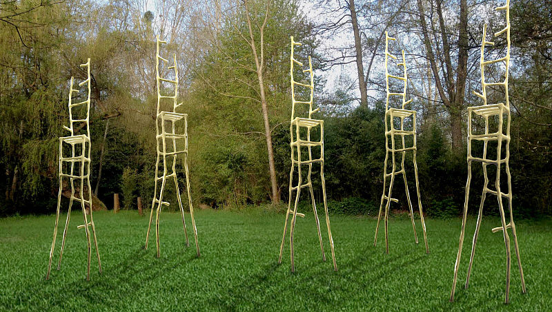 Мой проект представлял из себя 6 искаженных лестниц-стульев высотой до 5 метров. Слава выделил под них целую поляну в саду, где они должны были объединиться в мистический «священный круг», а на самих стульях-лестницах происходить действие. Помимо художественной задачи, сложность заключалась еще и в технической части, так как конструкция высоких лестниц должна была крепиться к поляне и при необходимости “отстегиваться” так, чтобы на земле не оставалось никаких заметных конструктивных элементов. Моей безумной (как мне тогда казалось) фантазией была идея поставить лестницы в реку, где стоя в бурном потоке реки с них можно было бы наблюдать за течением воды и жизни».