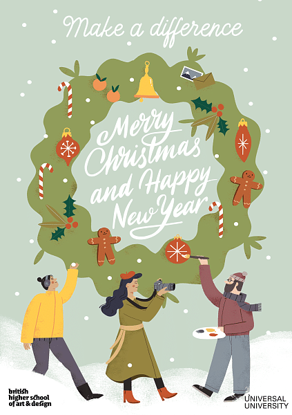 В декабре в преддверии новогодних праздников Universal University, в состав которого входит Британская высшая школа дизайна, провел конкурс среди своих студентов и выпускников на создание поздравительной открытки. Университет получил 16 оригинальных работ, отражающих концепцию “Make a Difference”, и выбрал победителем выпускницу БВШД Нелли Борисову. Именно ее дизайн открытки будет использован для поздравления партнеров и преподавателей UU.