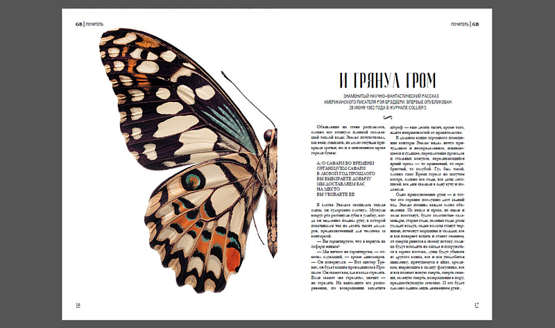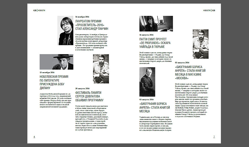 «Я разработала концепцию оформления литературного журнала для молодой аудитории. Особенность работы в том, что она построена на черно-белых изображениях и сдержанном и лаконичном дизайне. В отличии от большинства журналов в GoodBook упор делается не на изображения людей, а на иллюстрации, пейзажи, типографику. В ходе работы над проектом я искала существующие журналы с литературным уклоном и пришла к выводу, что на рынке крайне мало удачных примеров, на которые стоило бы ориентироваться, поэтому в работе я не опиралась на какие-то образцы, а попыталась передать свое видение».