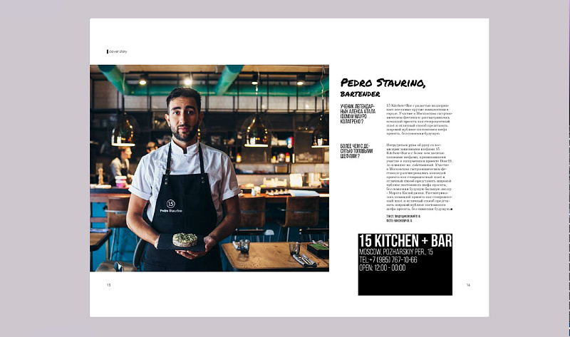 Темы рубрик, макеты обложек я обсуждала с представителями индустрии, брала у них интервью. Для профессионалов в макете журнала предусмотрен календарь с датами мастер-классов, конкурсов, анонсами вечеринок. Также будут статьи специалистов о мировых тенденциях, обучающие материалы по миксологии, информация о новых продуктах, инструментах и ингредиентах.