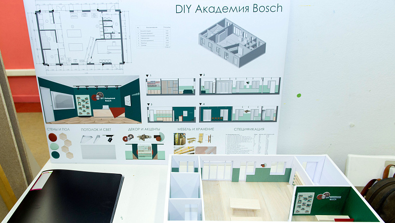 Располагаясь на территории завода Flacon, мастерская предоставляет любому желающему возможность поработать в столярном коворкинге, а также приобрести на специальных курсах базовые столярные навыки. Студенты БВШД получили в качестве задания бриф разработку обновленного интерьера мастерской DIY Академия Bosch. В ближайшее время будут объявлены результаты этого проекта и произойдет реновация пространства Академии.