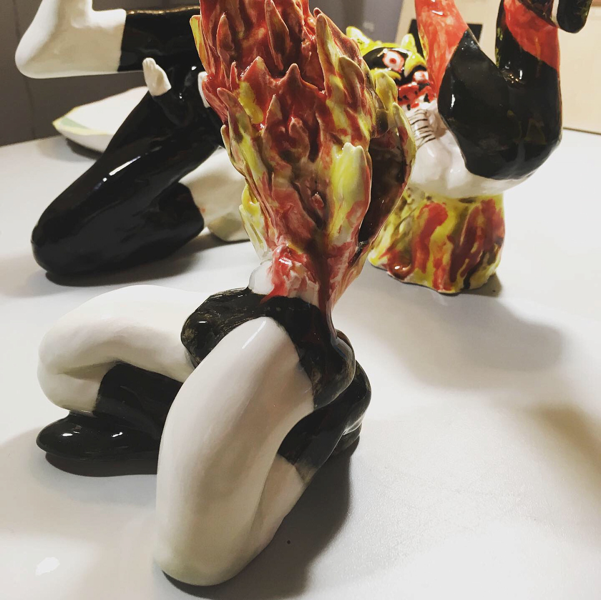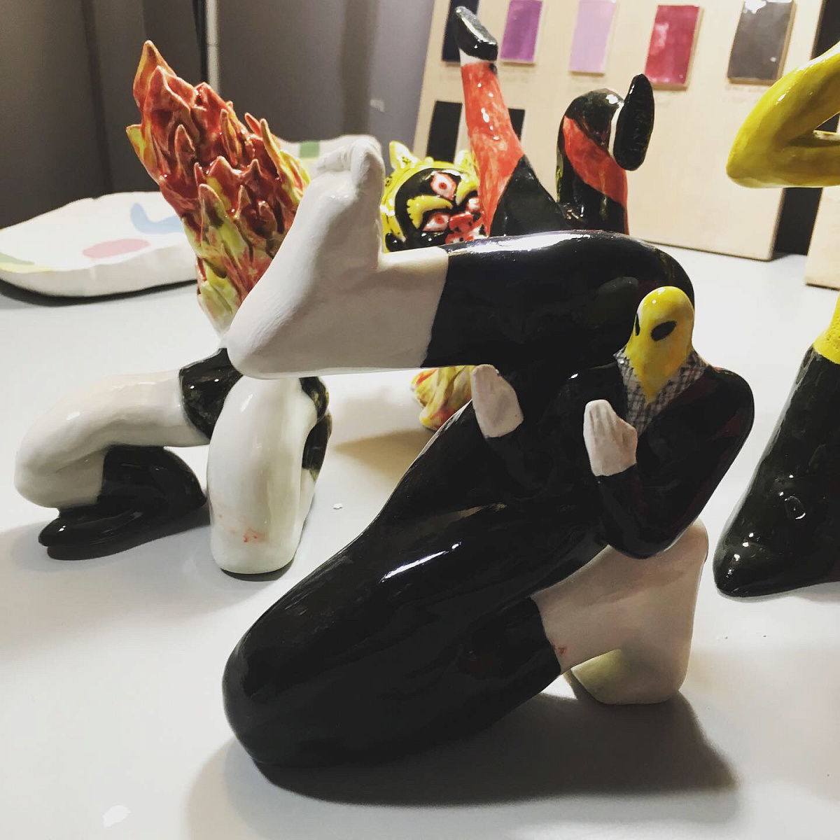 Любимые проекты у меня обычно те, которые происходят прямо сейчас. На данный момент это серия живописи, которой я занимаюсь очень плотно и планирую заниматься в ближайшие месяцы. Ещё в составе «Ущерба» мы осуществили проект «Драчки». Это комикс-зин, целиком состоящий из непрерывной композиции длинной 8 метров, в которой все со всеми дерутся. Можно много говорить про психотерапевтичность и телесность, но на самом деле просто драчки любят все. Продолжили мы это дело серией керамических скульптур, которые, помимо драчек, вдохновлены фарфоровыми статуэтками ЛФЗ.