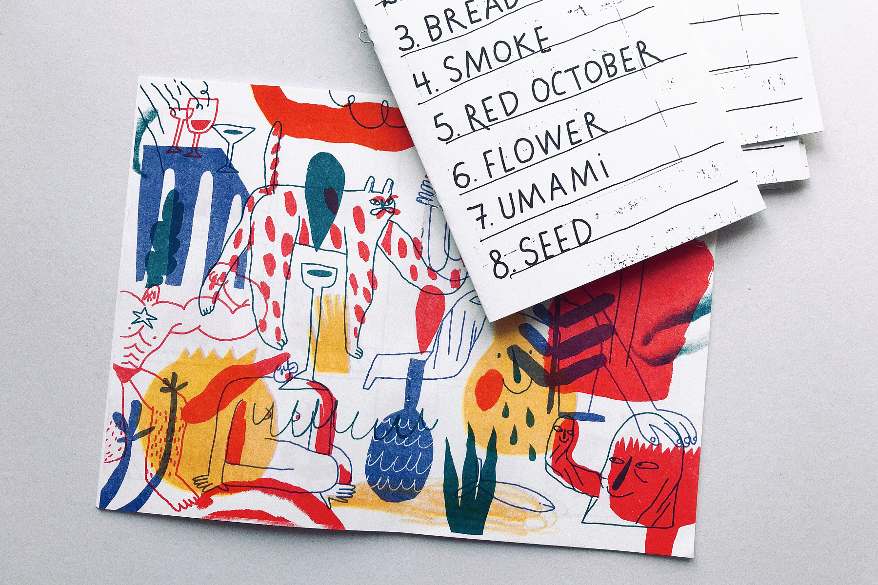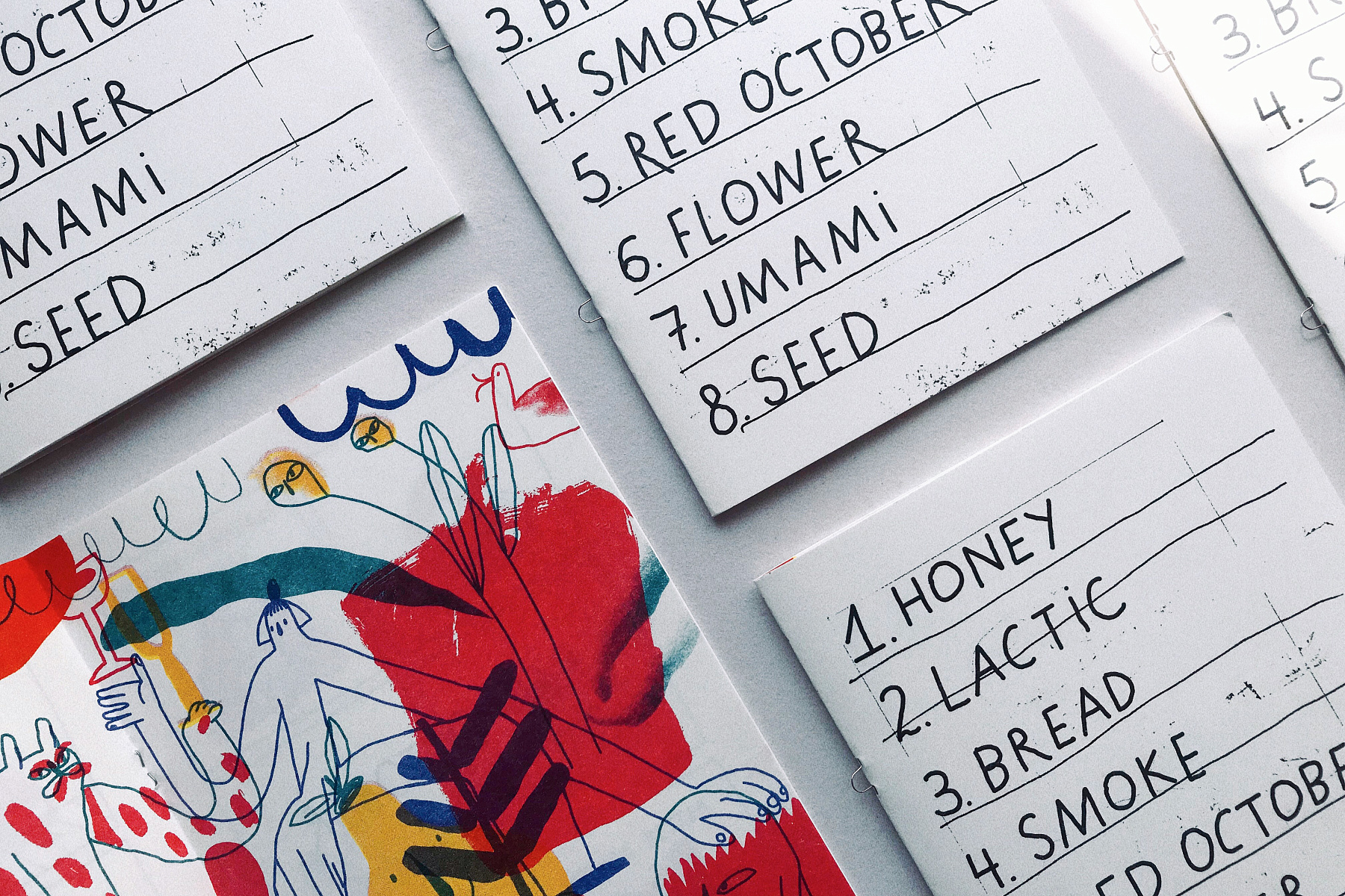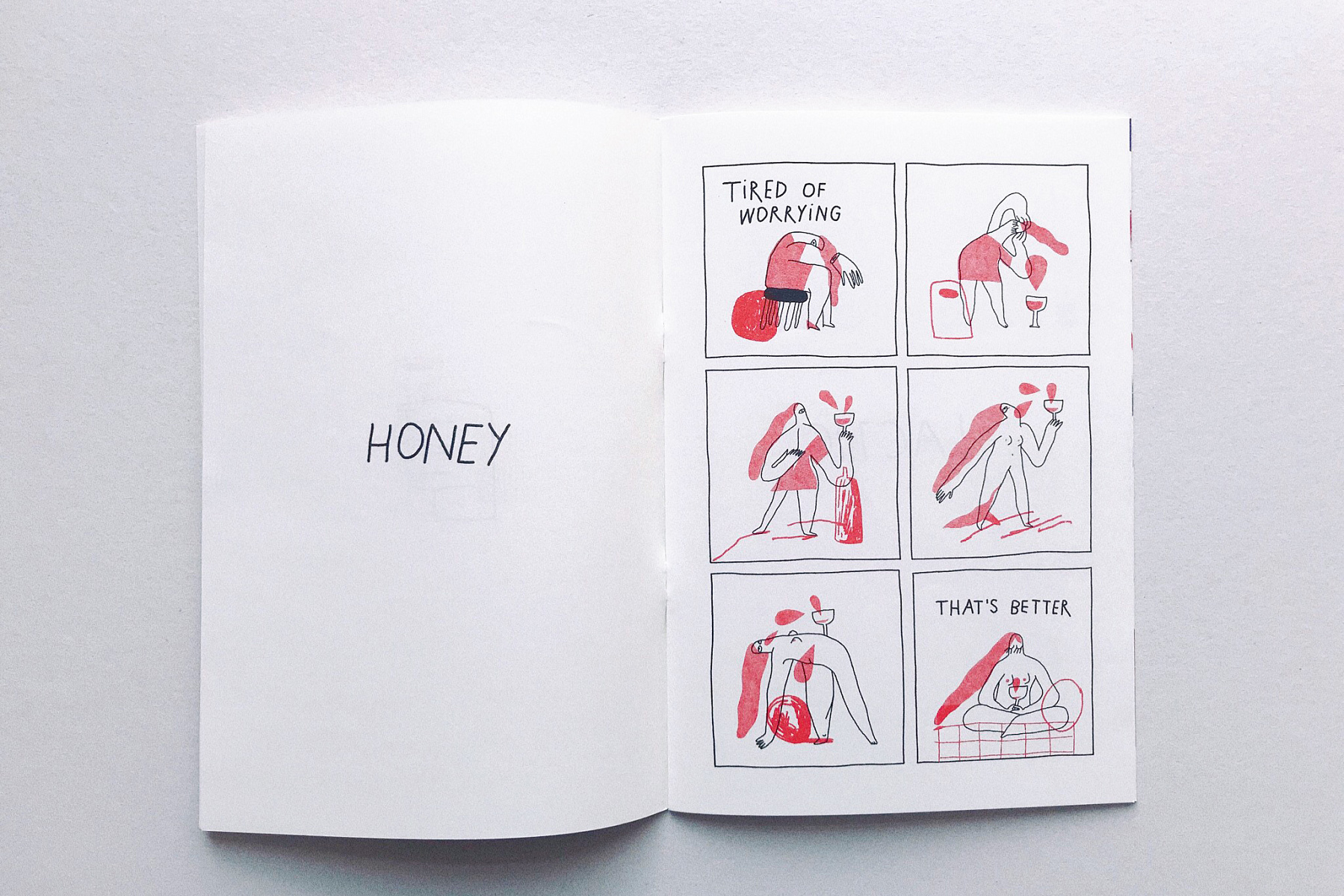 Также у каждой из нас есть личные большие проекты. Меня затянуло в винную барную среду. Я оформляла бар Bambule на Солянке — делала полиграфию, вывеску, логотип. Недавно сделала зин-меню для бара «Коробок» на Большой Дмитровке. Задача была придумать меню не похожее на меню, и я нарисовала комиксы к восьми коктейлям. Каждая история рассказывает о том, что с тобой произойдёт, если выпить определённый напиток. Так можно определиться с выбором и повеселиться в процессе.