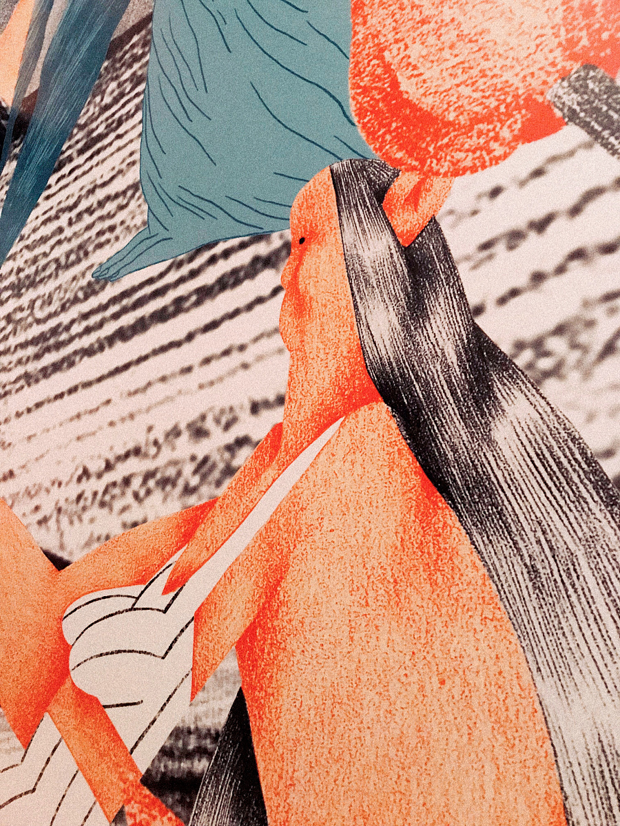 Таня: Самый масштабный проект «Акулки» — это выставка в «Манеже», которая идёт в данный момент. Под руководством Вити Меламеда и в коллаборации с нашими коллегами из команд «Ущерб» и «Типацеха» мы оформили павильон «Графика» в Центральном выставочном зале. Делали долго, рисовали месяц, и сейчас наши гигантские джунгли с женщинами и зверями распечатаны на восьмиметровых полотнах. Выглядит захватывающе.