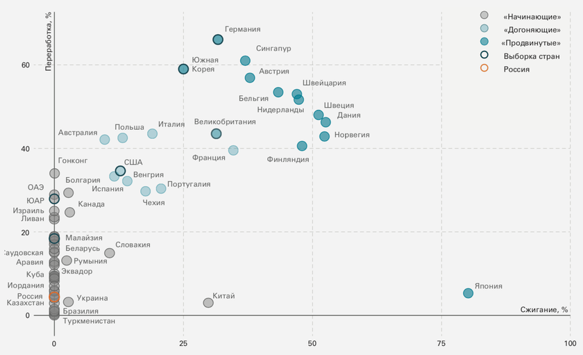 График распределения стран по доле переработки и сжигания отходов на основе данных 68 стран: из статьи StrelkaMag «Мировой опыт: 6 примеров эффективной работы с отходами».