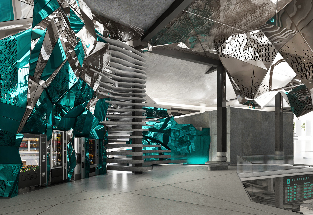 Основой для выбора материалов заложили принципы Sustainability. Так, например, для зон с высокой степенью проходимости проектом предложено использование плитки, собирающей кинетическую энергию от шагов пешеходов. Вся отделка полностью перерабатываемая, часть мебели даже выполняется из переработанного строительного материала. Элементы конструкции и дизайна модульные, взаимозаменяемые. Частая проблема аэропорта: реверберация также решается материалами и геометрией. Якорные металлические потолки изумрудного цвета как преломляют звук своей формой, так и поглощают за счет перфорации и звукопоглощающего материала внутри. А еще важно, что аэропорт стремится воспитать экологичное поведение во всем мире. Так, если судить, что это связующее звено между странами, то, донеся информацию в одной точке, она в прямом смысле разлетится в другие! Провокация экологичного поведения повсюду: раздельный сбор мусора, тут же с пояснениями видео и 2D проекции на стены о пользе, методах, результатах сепарации и переработки. Бесплатная питьевая вода отличного качества помогает в борьбе с пластиковыми бутылками. А слипбоксы помимо очевидного позволяют транзитным пассажирам не ездить в городские отели, тем самым не оставлять углеродный след.