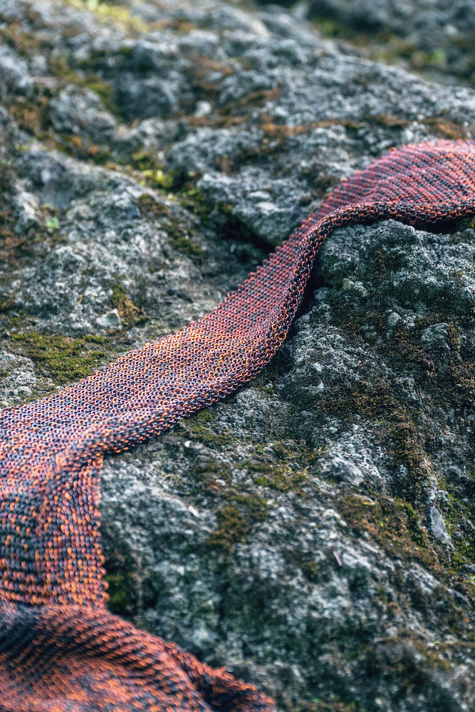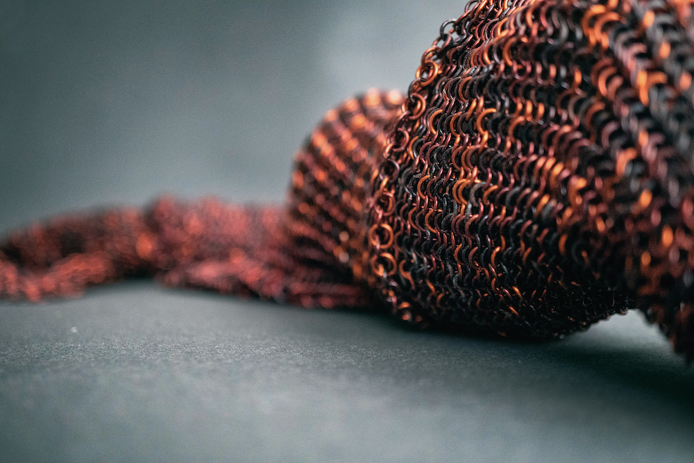 Александра: Для конкурса я написала заявку, которая объединяет две, казалось бы, противоположные сферы исследования. С одной стороны, я опиралась на текст Доны Харауэй «Манифест киборга» (текст как раз был предложен куратором проекта Снежаной Кръстевой), а с другой — продолжала своё исследование по сказам Бажова «Малахитовая шкатулка». Пересечением для меня как раз оказалась идея киборга как существа, не имеющего опыта рождения и опыта смерти. Удивительно, но концепция технологий эктогенеза находится примерно на уровне XV века — мы по-прежнему относимся к зарождению и вынашиванию человеческой жизни, как к яйцу в инкубаторе. Совершенно опускается тот момент, что субъектность человека формируется в процессе отделения от матери. В своей работе я фантазирую на тему того, как же может выглядеть квази-кожа такого существа, который никогда не рождался и не имел опыта общей с матерью кожи. Получилась такая шкурка ящерицы, сплетенная из металлических колечек — с одной стороны, утрировано защищающая и архаичная, а с другой — проницаемая и уязвимая.